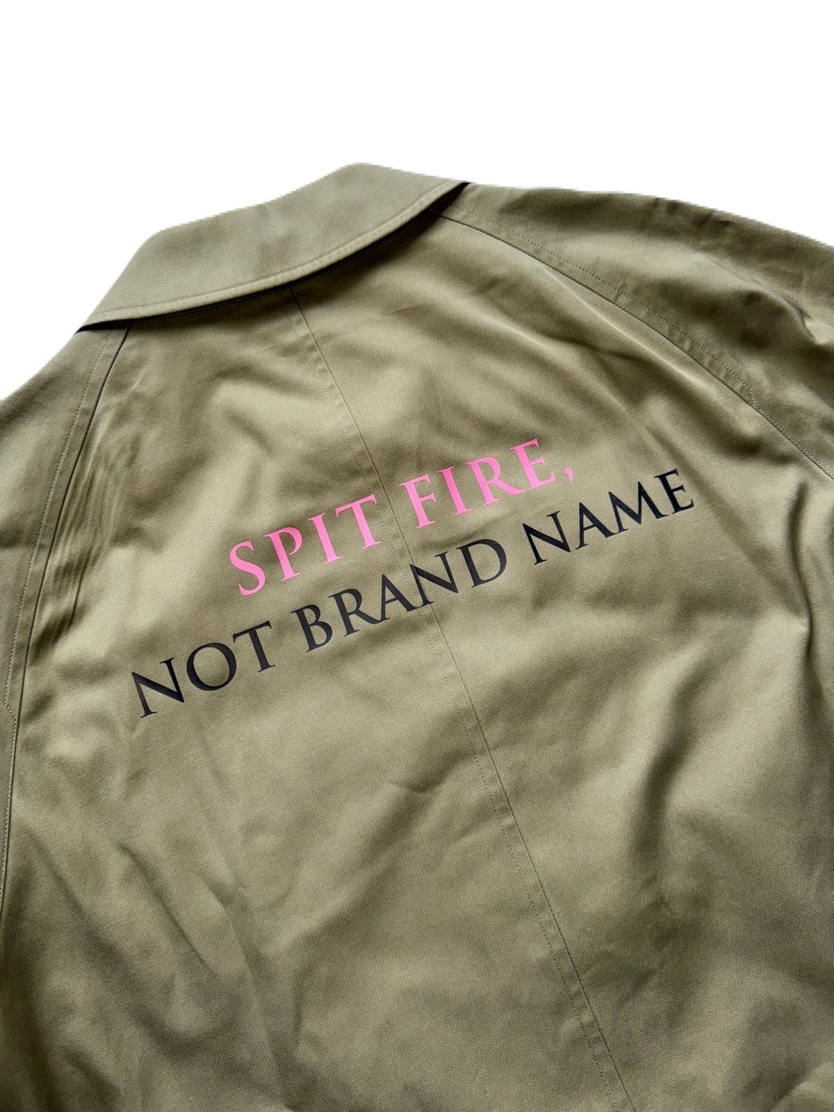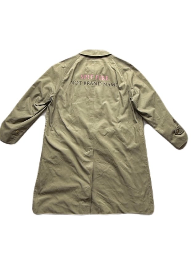 バーバリーバルカマンコートのヴィンテージリメイク、「SPIT FIRE」カーキ色、膝上ミドル丈、サイズはM~Lざっくり着れます。
