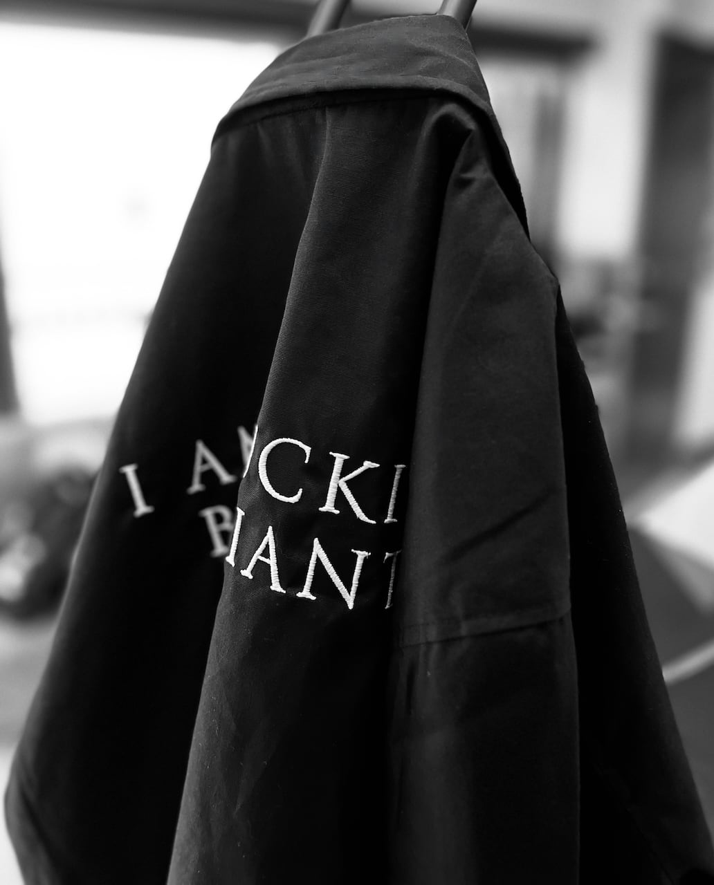 袖のIAFB、バックのI AM... ともに蓄光糸で刺繍。
